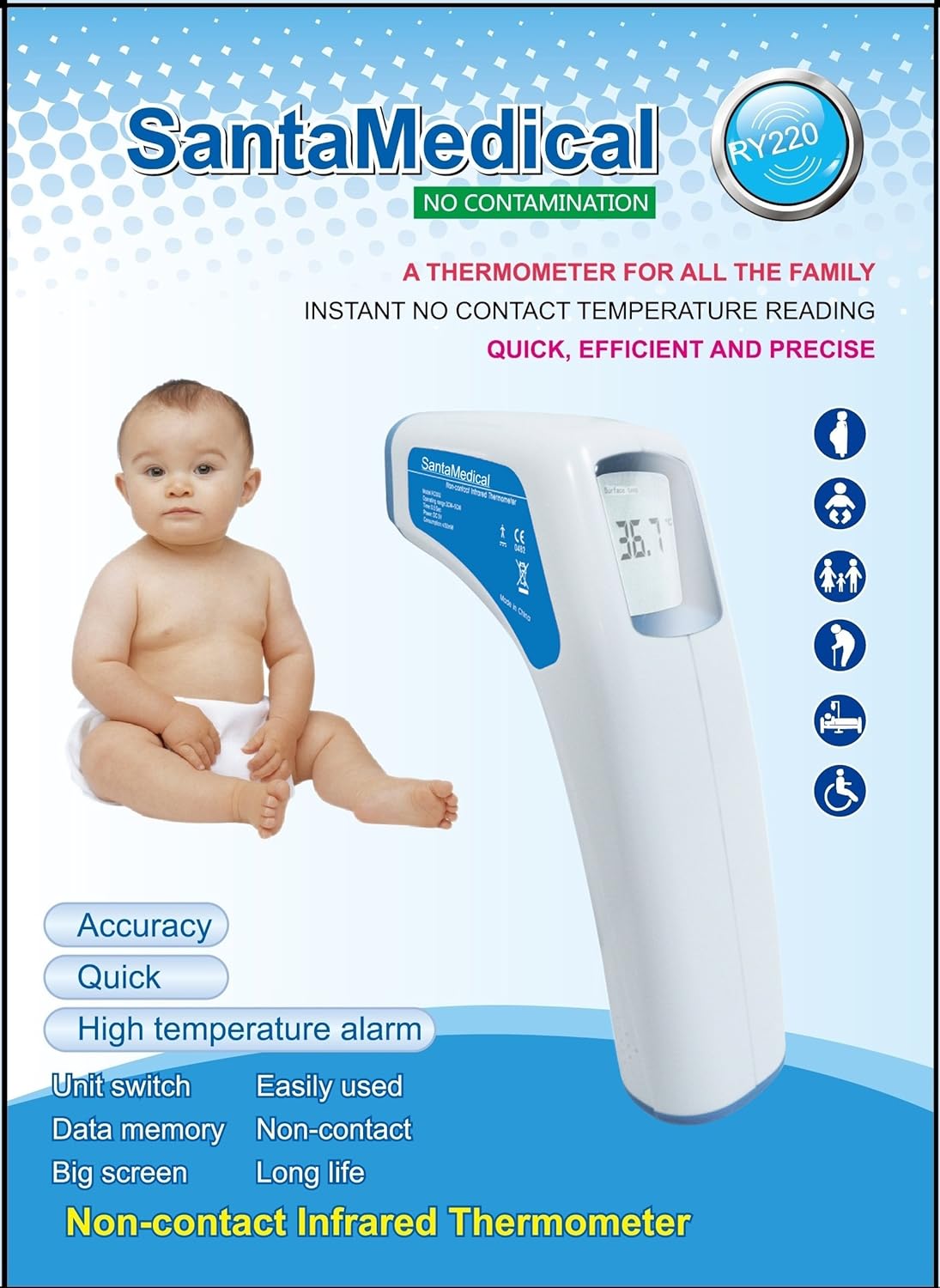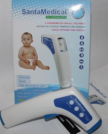 Santamedical Non-contact Infrared Thermometer – бесконтактный инфракрасный (ИК) клинический термометр обеспечивает простоту и точность измерения, принимая температуру поверхности зон на лице, такие как лоб, висок. Термометр получает температуру тела с 0,3 степенью точности, менее чем за 1 секунду через один клик. ИК термометр имеет интуитивно понятную систему наведения, для обеспечения позиционирования и подтверждения точных показаний. Температура (по Фаренгейту или по Цельсию) отображается на огромном с подсветкой ЖК-экране, для удобства чтения даже в полной темноте. Регулируемый звуковой сигнал предупредит Вас, если температура слишком высока. Поскольку не существует опасности заражения, можно сразу начать проверять температуру других членов семьи. Santamedical термометр был разработан специально для измерения температуры в области лба с расстояния 1 «-4″ (5-15см) в температурном диапазоне 89-109 F (32.0-43.0C) .